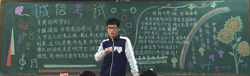 学院历来高度重视学风、考风建设,各团支书记分别以团支部为单位召开了诚信考试主题团课,团课上同学们讨论了考试作弊的严重后果和危害,认识到诚信考试的重要性。同学们还在诚信考试承诺书上签字,承诺做到积极备考,诚信考试,杜绝作弊。除此之外,此次系列教育活动还通过黑板报、条幅、校园广播等营造了诚信考试的浓厚氛围。